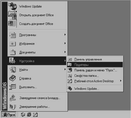 4 Щелкните на кнопке Start (Пуск) рабочего стола и выберите пункт Printers (Принтеры) из меню Settings (Настройка), затем сделайте двойной щелчок мышью на пиктограмме с именем вашего принтера.