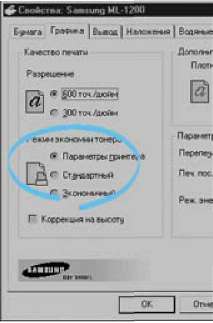 У драйвера принтера серии Samsung ML-1200 имеется экран справки, который можно активизировать щелчком на кнопке Help (Справка) в диалоговом окне свойств принтера. Кроме этого, вы можете щелкнуть на значке в правом верхнем углу окна, и затем щелкнуть на любом элементе настроек параметров.