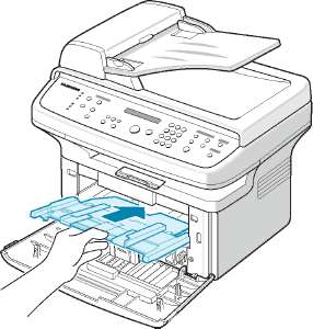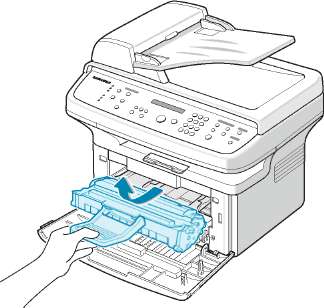 6 Установите картридж на место и закройте переднюю крышку. Печать автоматически возобновится.