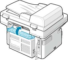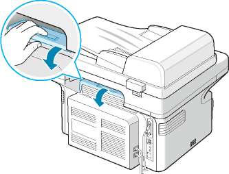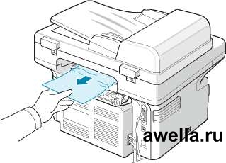 3 Если бумага не удаляется или удаляется с трудом, а также если не удается найти бумагу в выходном лотке, откройте заднюю крышку, потянув за ушко.