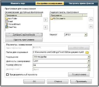 4. Чтобы изменить место сохранения и параметры сканирования, добавить или удалить приложения и поменять формат файлов, нажмите Настройки сканирования. Указать другое устройство сканирования можно с помощью функции Изменить порт (в локальном или сетевом режиме).
