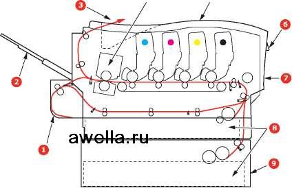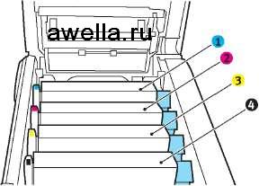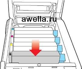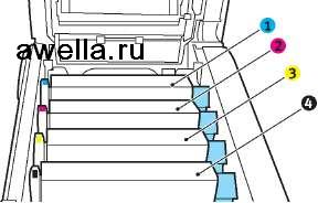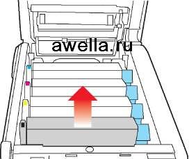 расположенного ближе всего к печке, верните четыре печатных барабана назад в полость барабана, убедившись в правильном порядке цветов.