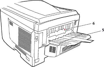 10. Откройте лоток заднего выхода бумаги (5) и проверьте наличие бумаги на пути заднего выхода (6).