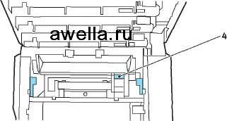 • Для удаления листа при входе в печку (3) отделите заднюю кромку листа от ремня, нажмите на рычаг освобождения печки (4) в направлении вперед и вниз для освобождения захваченного печкой листа, а затем вытащите лист сквозь полость барабана. Затем вновь верните рычаг освобождения в верхнее положение.