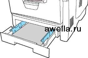 14. Выдвиньте лоток для бумаги и убедитесь в том, что бумага сложена в нем должным образом, не имеет повреждений, и направляющие бумаги находятся в правильном положении относительно краев листа. После завершения проверки задвиньте лоток на место.