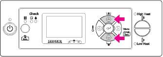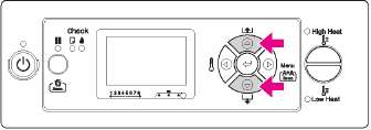 Выбор типа нагревателя. На ЖК-панели справа налево отображаются параметры нагревателя: Pre Heater, Platen Heater и After Heater. Выберите тип нагревателя, а затем нажмите на кнопку High Heat или Low Heat, чтобы отрегулировать предустановленную температуру.