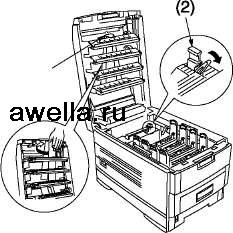 Мягко нажмите на цветной рычаг (5) вперед до упора для освобождения тонера в печатном барабане.