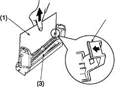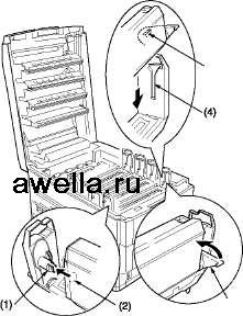 Мягко нажмите вниз, обеспечивая вхождение замыкающей шпильки (3) в желобок (4) печатного барабана.