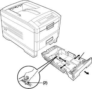 2. Отрегулируйте направляющие для бумаги (1) и задний стопор (2) для бумаги в соответствии с используемым размером бумаги.