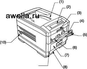 3. Панель на жидких кристаллах (LCD). Две строки буквенно-цифровых знаков показывают состояние принтера, пункты меню в режиме меню и сообщения об ошибках.