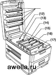Блок для термического закрепления тонера. Барабан изображения (бирюзовый). Барабан изображения (пурпурный). Барабан изображения (желтый). Барабан изображения (черный).