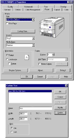 Проверьте, что имя размера листа, задаваемого пользователем, фигурирует в поля [Size (Размер)], затем Нажмите ОК и закройте диалоговое табло принтера.