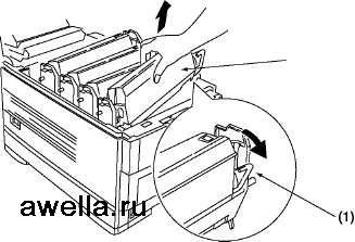 6. Убедитесь, что два замыкающих рычага (1) фиксируют блок закрепления тонера на месте.