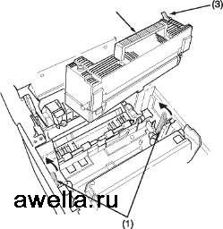 3. Отожмите замыкающий рычаг (1) и, используя ручки (2) и (3), вытащите приводной ремень из принтера.