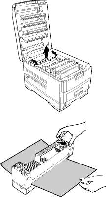 • Печатный барабан был подвергнут воздействию света. Вытащите печатный барабан из принтера и поместите его в темное место на несколько часов. Если это не поможет, замените печатный барабан.
