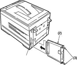 3. Вставьте плату сетевого интерфейса (2) в разъем опций и закрепите его двумя винтами (3).