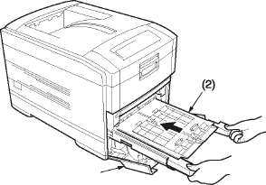 3. Вставьте блок дуплекса (2) в принтер, обеспечивая вхождение сторон блока дуплекса в пазы принтера.