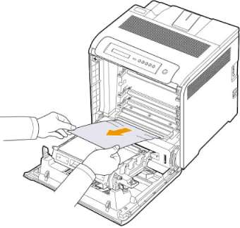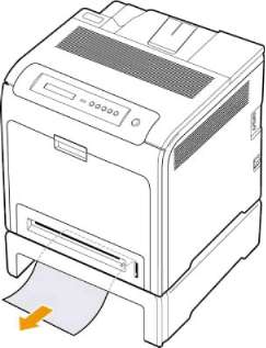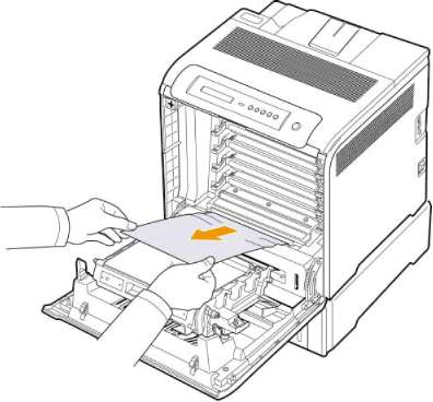 2 Если замятую бумагу видно, осторожно вытяните ее из принтера, как показано на рисунке.