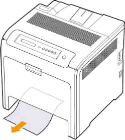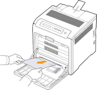 Если при печати с использованием многоцелевого лотка принтер определяет, что бумага отсутствует или загружена неправильно, то замятую бумагу можно удалить следующим образом.
