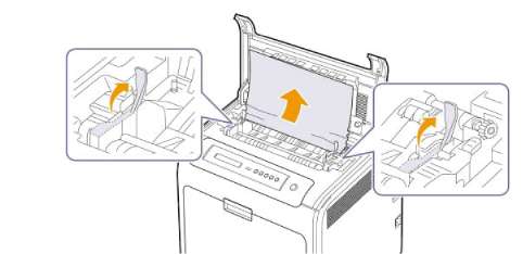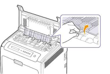 4 Поднимите фиксатор для удаления замятой бумаги, чтобы ослабить нагревающуюся часть термофиксатора, и аккуратно извлеките замятую бумагу.