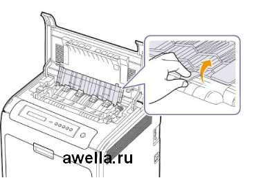 Если замятие бумаги произошло в области термофиксатора, вытащить замятую бумагу можно следующим образом.