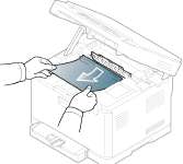 4. Осторожно вытяните мятую бумагу в указанном направлении. Большая часть замятой бумаги удаляется на этом этапе.