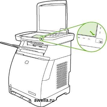 1. Поднимите крышку планшетного сканера и поместите оригинал на стекло планшетного сканера лицевой стороной вниз таким образом, чтобы левый верхний угол документа оказался в правом нижнем углу стекла. Аккуратно закройте крышку.