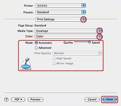 Для параметра Media Type (Тип носителя) выберите Envelope (Конверт) и настройте параметры Color (Цвет) и Mode (Режим).