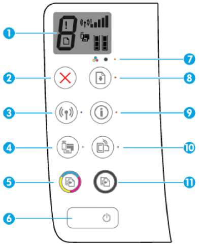 Дисплей панели управления: обозначает число копий, ошибки с носителями, ошибки беспроводного подключения и уровень сигнала, состояние Wi-Fi Direct и уровень чернил.
