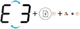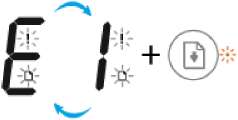 • Значение значка Количество копий попеременно меняется с буквы «Е» на цифру «3». В то же время индикатор Возобновить и Предупреждение о чернилах мигают.