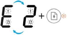• Значение значка Количество копий попеременно меняется с буквы «Е» на цифру «2». В то же время значок Ошибка, значок Проблема с бумагой и индикатор Возобновить мигают.