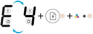 Значение значка Количество копий попеременно меняется с буквы «Е» на цифру «4». В то же время значок Ошибка, значок Проблема с бумагой, индикатор Возобновить и индикатор Предупреждение о чернилах мигают.