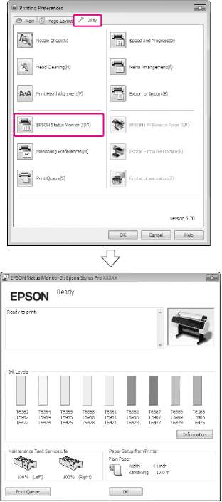 Откройте окно драйвера принтера, перейдите на вкладку Utility (Утилита) и нажмите EPSON Status Monitor 3.