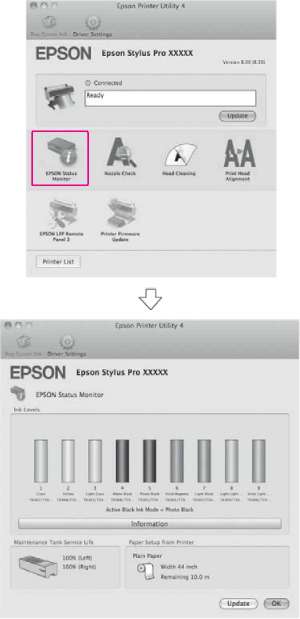 Откройте диалоговое окно Epson Printer Utility 4 и затем щелкните EPSON StatusMonitor.