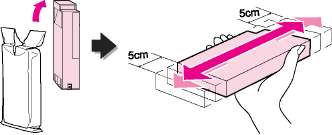 Извлеките новый картридж из упаковки и затем встряхните его примерно 15 раз в горизонтальной плоскости с амплитудой в 5 см как это показано на иллюстрации.
