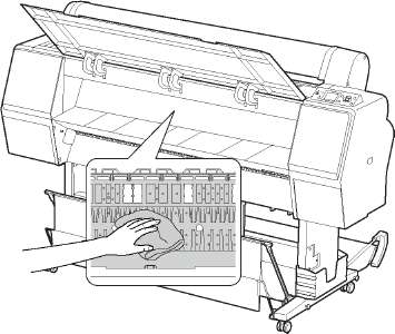Откройте переднюю крышку и аккуратно удалите пыль и грязь с внутренней поверхности принтера мягкой чистой тканью.