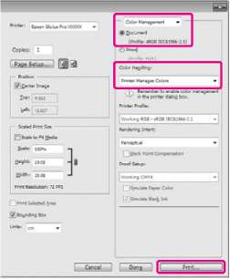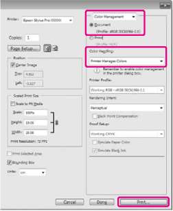 Выберите Color Management и затем Document. В поле Color Handling выберите Printer Manages Colors и щелкните кнопку Print (Печать).