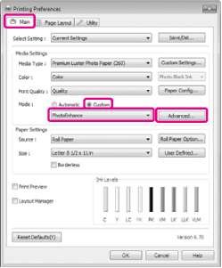 Когда появится диалоговое окно Main драйвера принтера, щелкните Custom PhotoEnhance и затем Advanced.
