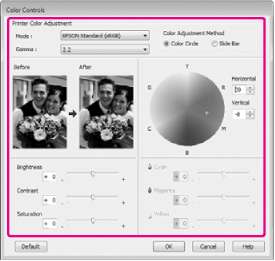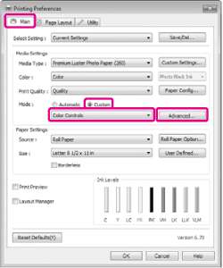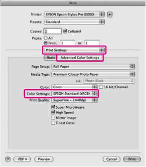 Выберите Print Settings, затем из списка Color Controls в Color Settings выберите EPSON Standard (sRGB) или Charts and Graphs. Для того чтобы настроить параметры вручную, щелкните Advanced Color Settings.