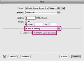 В Mac OS X 10.7, 10.6 и 10.5: из списка выберите Color Matching и затем щелкните EPSON Color Controls.