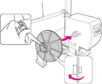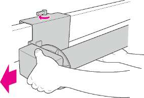 Поверните рычаг, чтобы разблокировать съемную часть, и сдвиньте ее до упора влево, чтобы извлечь из защелки фланца конец стержня бобины.