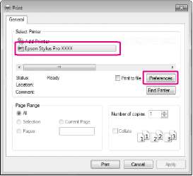 Убедитесь в том, что выбран нужный принтер. Нажмите Printer (Принтер), Setup (Настройка), Options (Дополнительно), Properties (Свойства) или Preferences (Настройка).