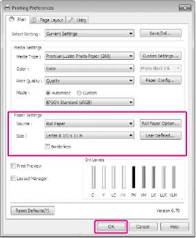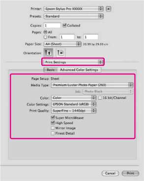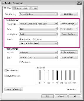 Задайте значения для параметров Media Type, Color и Print Quality в соответствии с методом подачи бумаги, загруженной в принтер (для форматных листов). Обычно возможно производить корректную печать, просто задав нужные настройки на экране Print Settings.