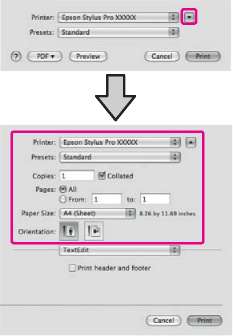 Если используется операционная система Mac OS X 10.4 или не отображаются элементы экрана Page Setup в окне Print, так как приложение запущено в операционной системе Mac OS X 10.7, 10.6 или 10.5, сделайте следующее для отображения экрана Page Setup.