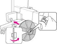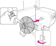 Поверните рычаг, чтобы разблокировать съемную часть, и сдвиньте ее до упора влево, чтобы извлечь из защелки фланца конец стержня бобины.