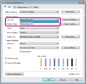 В меню Ink (Чернила) выберите нужный тип черных чернил.