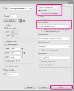 Выберите Color Management и затем Document. В поле Color Handling выберите Printer Manages Colors и щелкните кнопку Print (Печать).