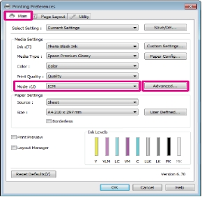 На вкладке Main драйвера принтера для параметра Mode выберите Custom, затем выберите ICM и далее щелкните Advanced.