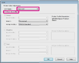 Когда на вкладке Main драйвера принтера для параметра Media Type выбраны специальные носители Epson, автоматически выбирается и отображается в поле Printer Profile Description профиль принтера, соответствующий носителю и цвету.