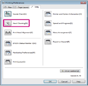 B диалоговом окне Properties (или Print Settings) на вкладке Utility драйвера принтера щелкните Head Cleaning.